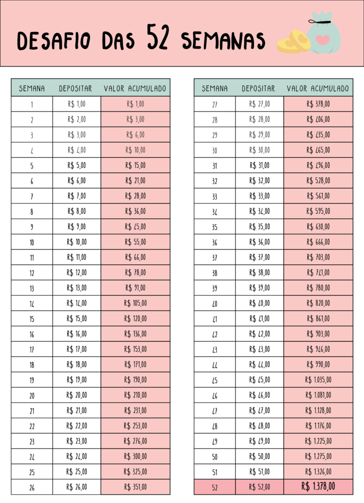 Para que você possa escolher o valor para começar o seu desafio, você tem que conhecer muito bem o seu orçamento para que você consiga cumprir o desafio até o final. Pois, se você escolher começar com R$5,00, esteja ciente que na última semana você estará desembolsando R$260,00. Veja: