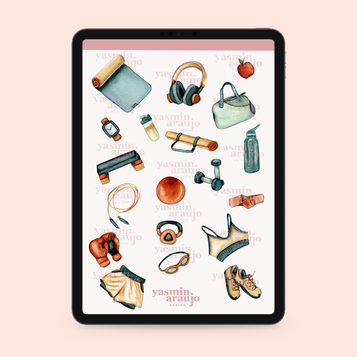 Os Adesivos digitais – Fitness Aquarela é uma colaboração com a Clycia Art e Illustration e foram pintados manualmente. Essa cartela de adesivos digitais  inclui adesivos pré-cortados e uma cartela inteira que pode ser usado com Goodnotes, Samsung Notes, Notability, Noteshelf e outros aplicativos de planejamento digital.