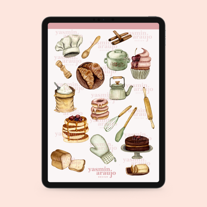 Os Adesivos digitais – Receita Aquarela é uma colaboração com a Clycia Art e Illustration e foram pintados manualmente. Essa cartela de adesivos digitais inclui adesivos pré-cortados e uma cartela inteira que pode ser usado com Goodnotes, Samsung Notes, Notability, Noteshelf e outros aplicativos de planejamento digital.