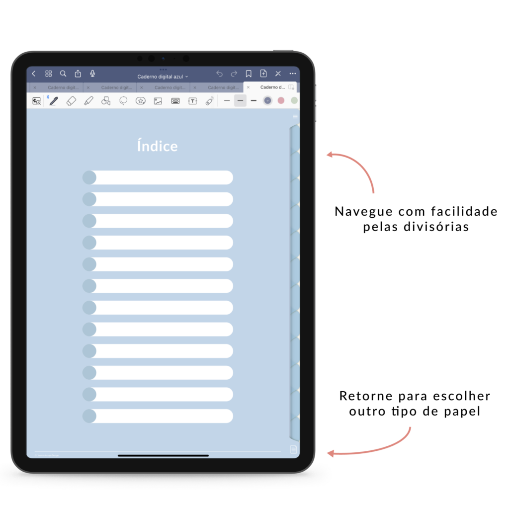 O Caderno Digital – Azul tem o design exclusivo e foi projetado para facilitar a sua vida na hora de estudar. Com 5 modelos de folhas com linha brancas e com linhas escuras, sendo elas, pautada, quadriculada, pontilhada, cornell e em branco, o caderno traz a possibilidade de você escolher qual lhe agrada mais.