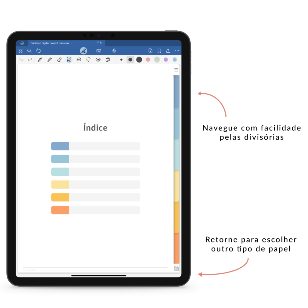 O índice te traz a facilidade de se organizar. Cada cor é correspondente a uma divisória.