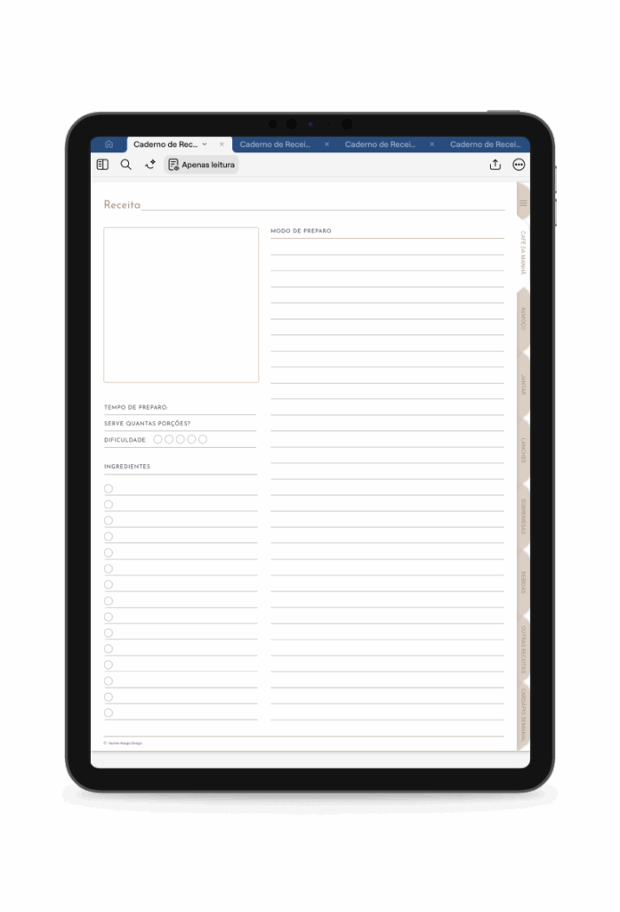 Com um índice clicável e divisórias por categorias, o Caderno de Receitas Digital facilita a navegação entre suas receitas de forma rápida e intuitiva.