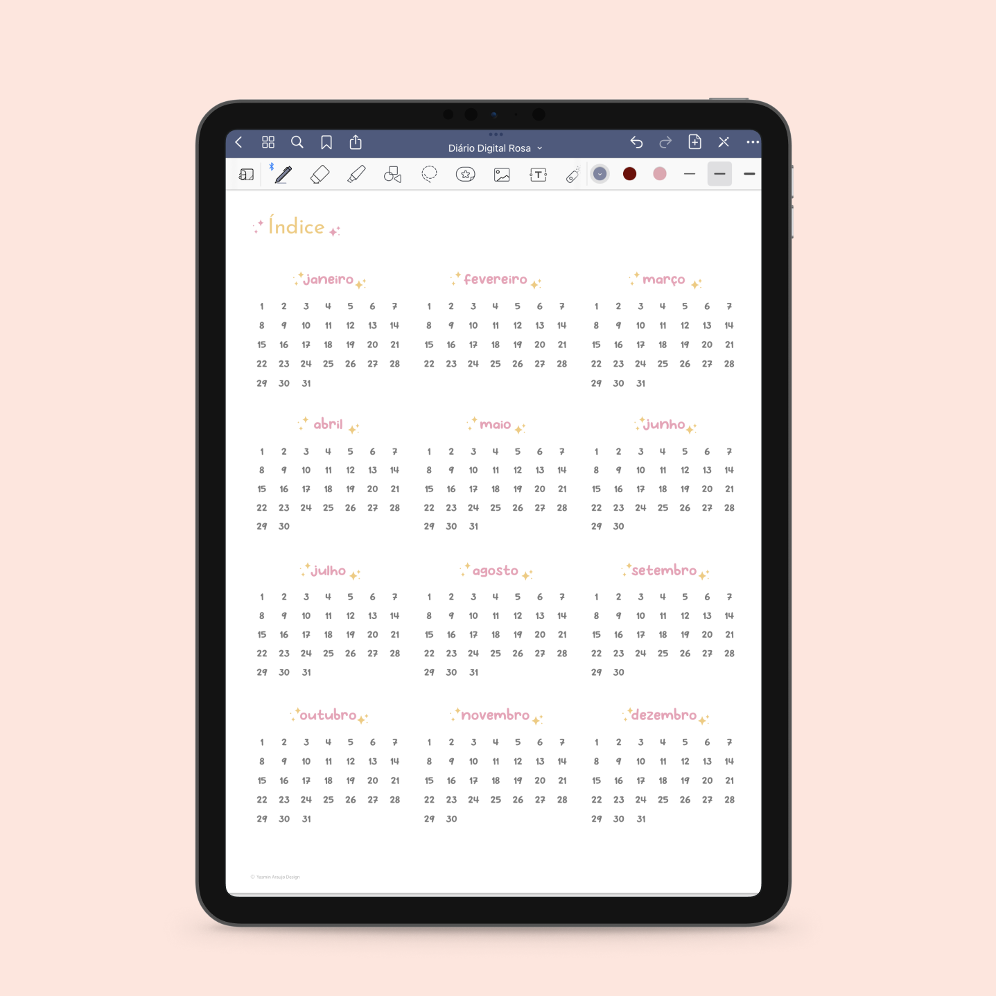 Com um índice com todos os meses do ano, o Diário Digital Rosa te guia para o dia atual ou para uma lembrança boa de dias anteriores.