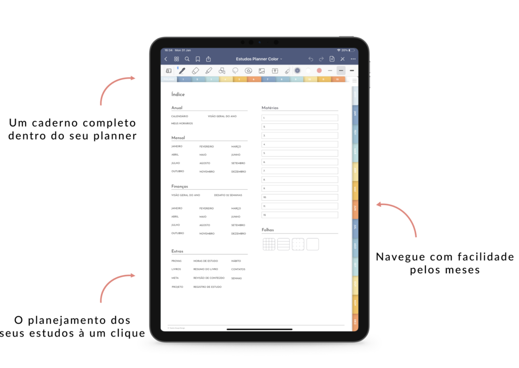 O Estudos Planner Color possui links que te levam para todos os lugares do planner facilitando a utilização de todos os recursos.