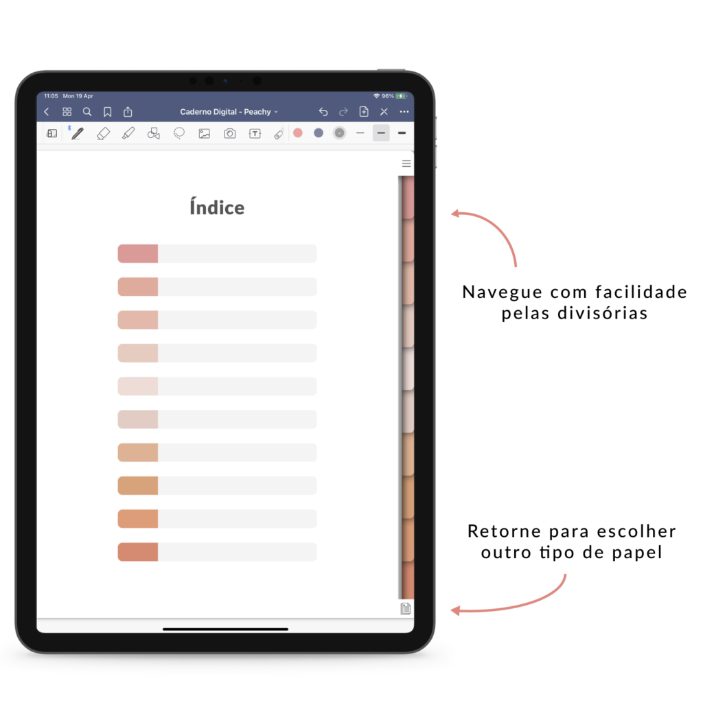 Com o Caderno Digital Peachy, você pode facilmente organizar todas as matérias do seu curso. Com um índice e 10 divisórias de cores diversas, você ainda pode escolher entre 4 tipos de papeis. Este não é um caderno comum! A combinação de elementos de design exclusivos e layouts estratégicos com links elevará a sua organização na hora de estudar.