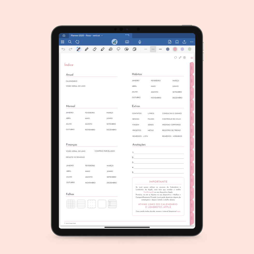 Com links para o Google Agenda e Calendário e Lembretes Apple, o Planner Digital 2025 vai facilitar a sua organização.